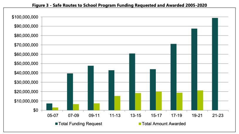 The Safe Routes to School program is vastly underfunded in terms of what’s been allocated by the legislature compared to what local governments request to be able to safely encourage active transportation trips to schools. The level of those requests has been steadily increasing in recent years while the state funding level has not kept up. The $148 million the package authorizes (which translates to $18.5 million per biennium) is not nearly enough to keep up with the requests, many of which come from cities that have very limited choices and prospects for raising transportation revenue locally. For the 2021-2023 biennium, WSDOT projected that 102 out of 125 requests for Safe Routes to School project funding would be declined. Such a huge gap is also seen with the state’s Pedestrian and Bicycle grant program.