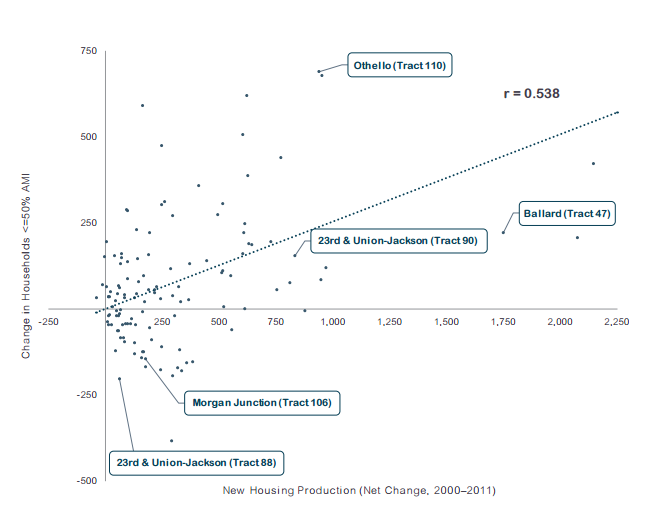 Some details are worth noting. First, the correlation is significant but small. Second, Seattle’s AMI has changed dramatically since 2000 and it’s unclear how the methodology accounted for this. Third, cities are extremely dynamic and interconnected–the same thing that causes a decreases in low-income households in one neighborhood could cause increases in another. Overall though, this is a good evidence that development doesn’t necessitate or equal displacement and might even counter displacement in some situations.