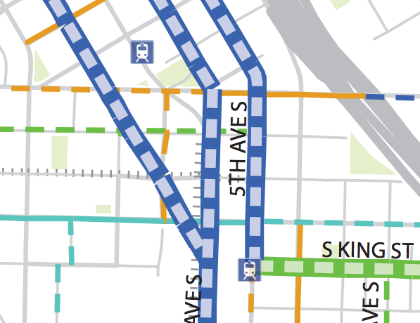 This week an update to the project website reveals the answer: the City won’t bother trying to make space on 4th Avenue S at all. Instead the only other planned north-south bike route through central downtown will jog back to 2nd Avenue via an obscure little street next to City Hall Park: Dilling Way. The Basic Bike Network advocates have rallied around called for the protected bike lane to extend to Jackson Street in order to better connect to Southeast Seattle.
