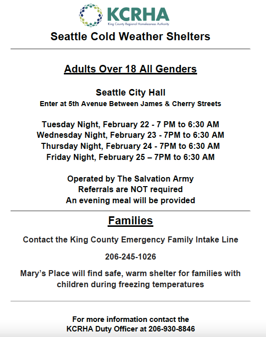 - Seattle City Hall – Single Adults (any gender): Enter on 5th Ave between James & Cherry St., open 7:00 PM – 6:30 AM starting Tuesday, Feb. 22 through the morning of Saturday, Feb. 26. Dinner will be provided. Space available for 96 people, operated by The Salvation Army.