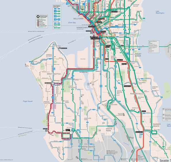 South Seattle has fewer frequent transit nodes created by buses since southern crosstown routes do not meet the frequent definition. The light rail stations do qualify as nodes though and the MHA maps suggests the urban village boundaries will be extended in station walksheds. West Seattle does have some frequent transit nodes including Westwood Village (where the C, 21, and 120 all meet) and 35th Ave SW and SW Avalon Way (where the C and 21 meet). Though partially in urban villages, boundaries should be extended from these nodes to the full 10-minute walkshed.