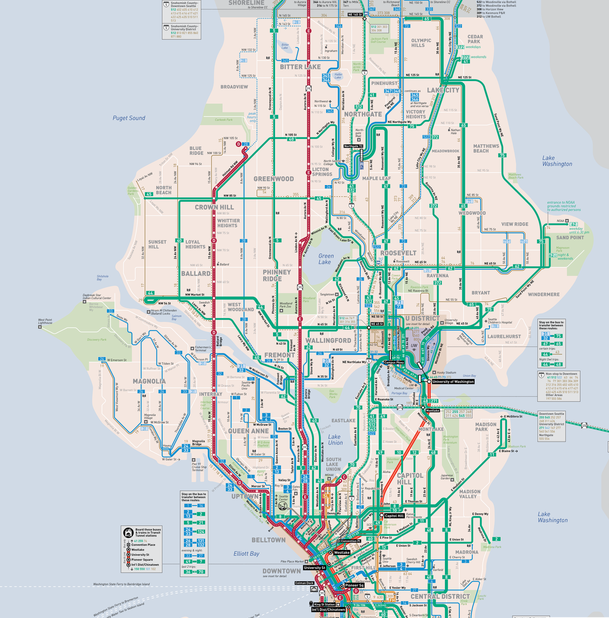 Northeast Seattle, which is currently pretty light on urban villages, got a handful of frequent transit nodes thanks to the U Link Bus Restructure and that suggests adding them as urban villages. Bryant, not yet an urban village, has a frequent transit node at N 65th St (Route 62) and 35th Ave NE (Route 65) and another at Sandpoint Way NE (Route 75) and 40th Ave NE (Route 65), which also puts Laurelhurst (and the much-debated Talaris site) in the walkshed of a transit node. The intersection of Route 62 and Route 75 give Sand Point a frequent transit node at N 65th St and Sandpoint Way NE. Alex Brennan and our editorial board noticed the relative paucity of urban village in Northeast Seattle in 2015 and recommended adding more.