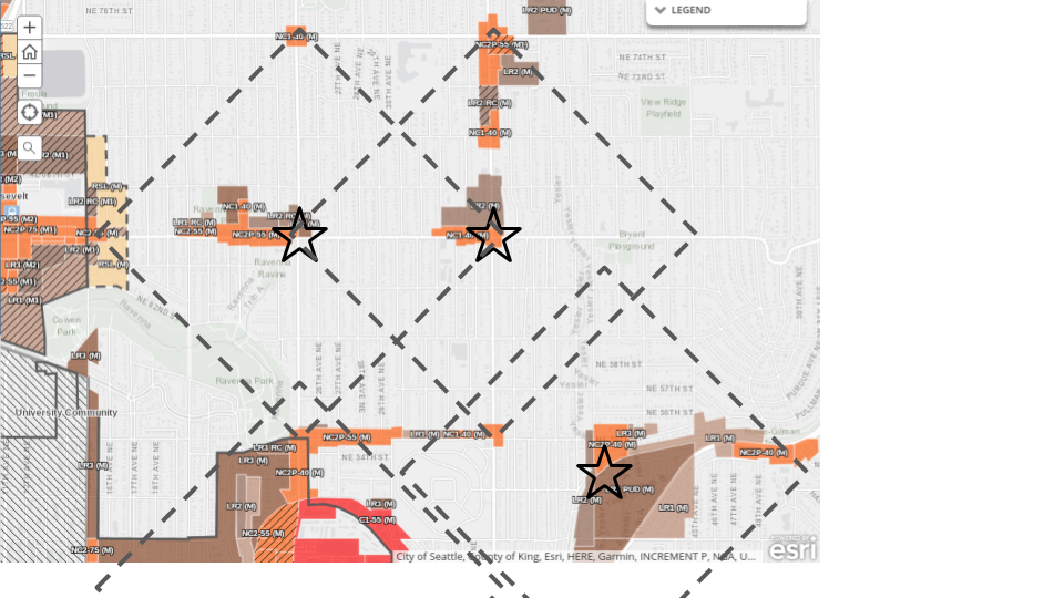Over the course of crafting the Mandatory Housing Affordability (MHA) rezone plan, Seattle Office of Planning and Community Development (OPCD) developed the principle of expanding urban village boundaries to ensure they stretched at least as far as a 10-minute walkshed from each village’s respective Frequent Transit Node(s). Frequent Transit Nodes were defined as light rail stations or the intersection of two frequent bus lines.