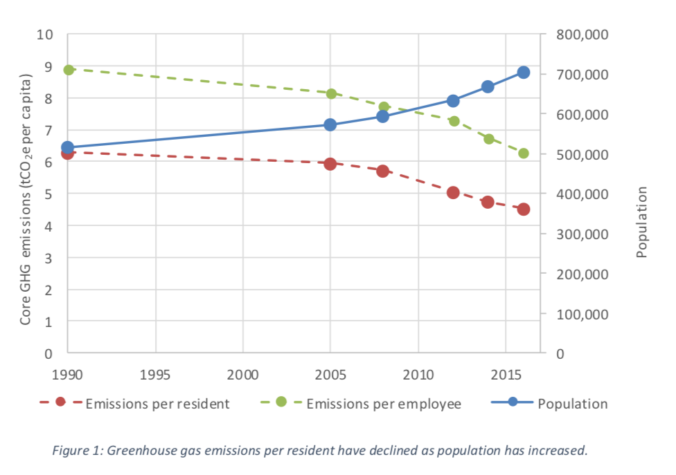 Of course, population growth has to be taken into account when analyzing Seattle’s carbon emissions. One potential bright spot is that as Seattle’s population has climbed, the amount of carbon emissions created per resident and per employee have both decreased, indicating that there just might be something to the argument that living in denser more energy efficient neighborhoods and commuting less by car reduces people’s carbon emissions.