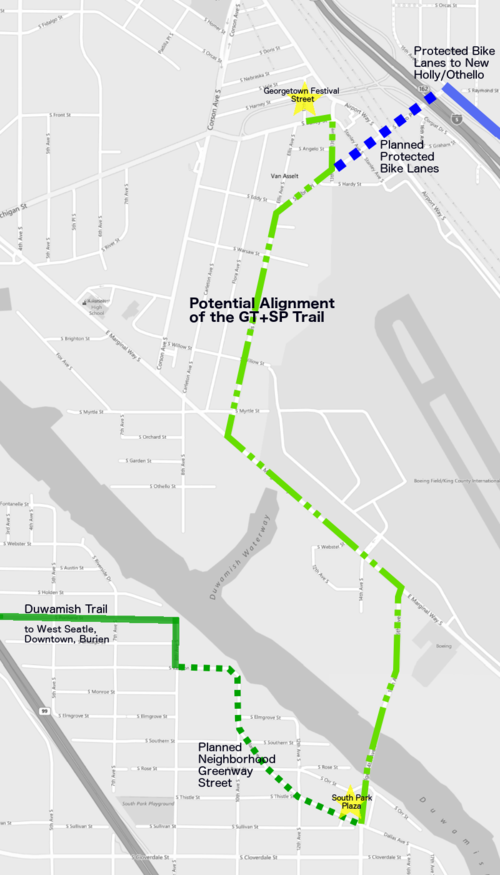 “We received six letters of support from local community groups for the connection and four of the letters (from the Georgetown South Park Trail Community Advisory Group, Duwamish River Cleanup Coalition Technical Advisory Group, South Park Neighborhood Association, and the Georgetown Community Council shared the following preference,” SDOT noted in its outreach report. That preference is: