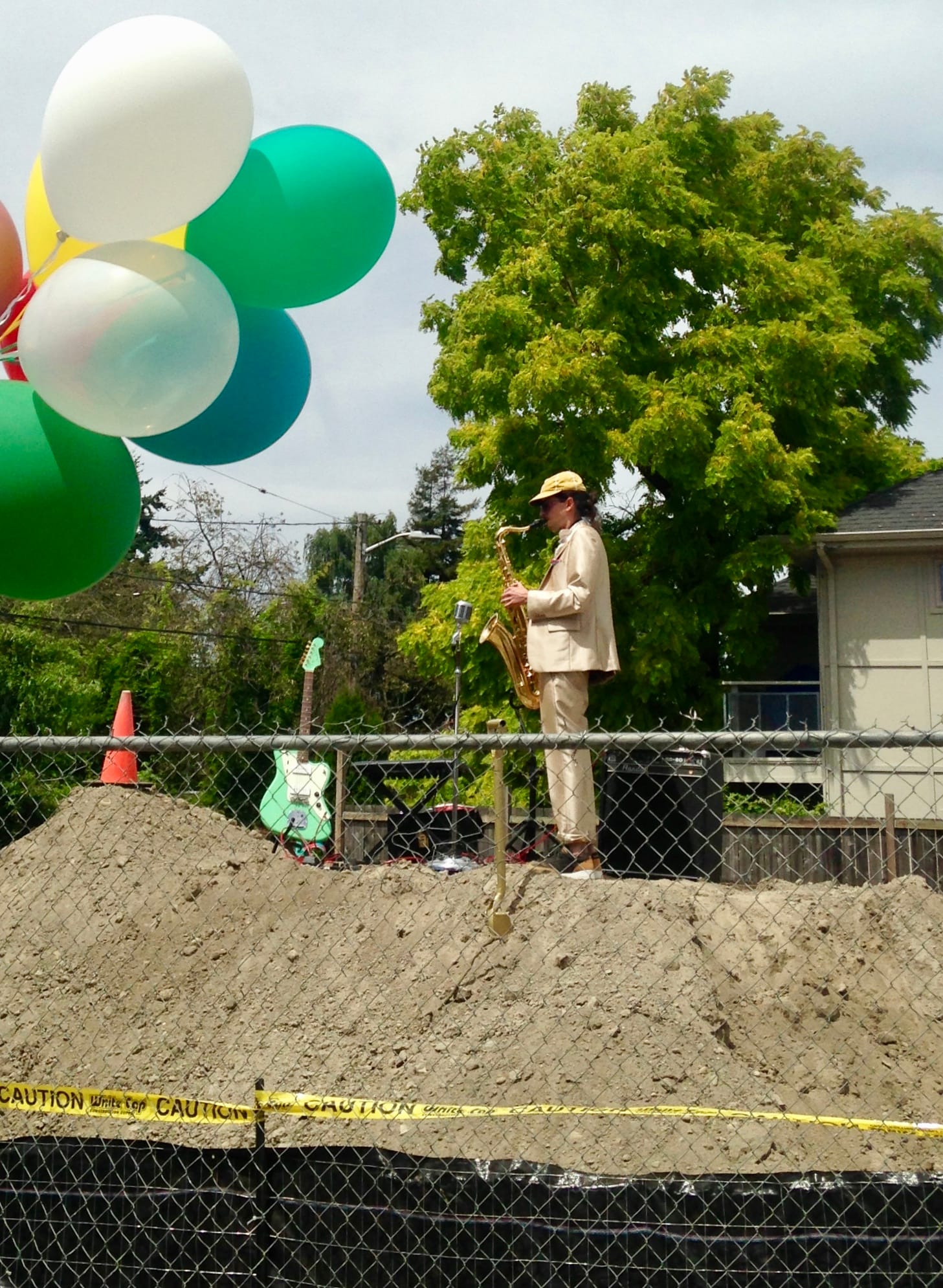 Today, however, the lot isn’t empty and the dirt is no longer toxic. A musician stands on top of the mound with an electric guitar and saxophone beside him. In defiance of the grime and heat, he wears a jaunty cream-colored suit. As he lifts the saxophone toward the sun, his notes spill over the block party where the curious people listen, stare, and chat about the land’s future.