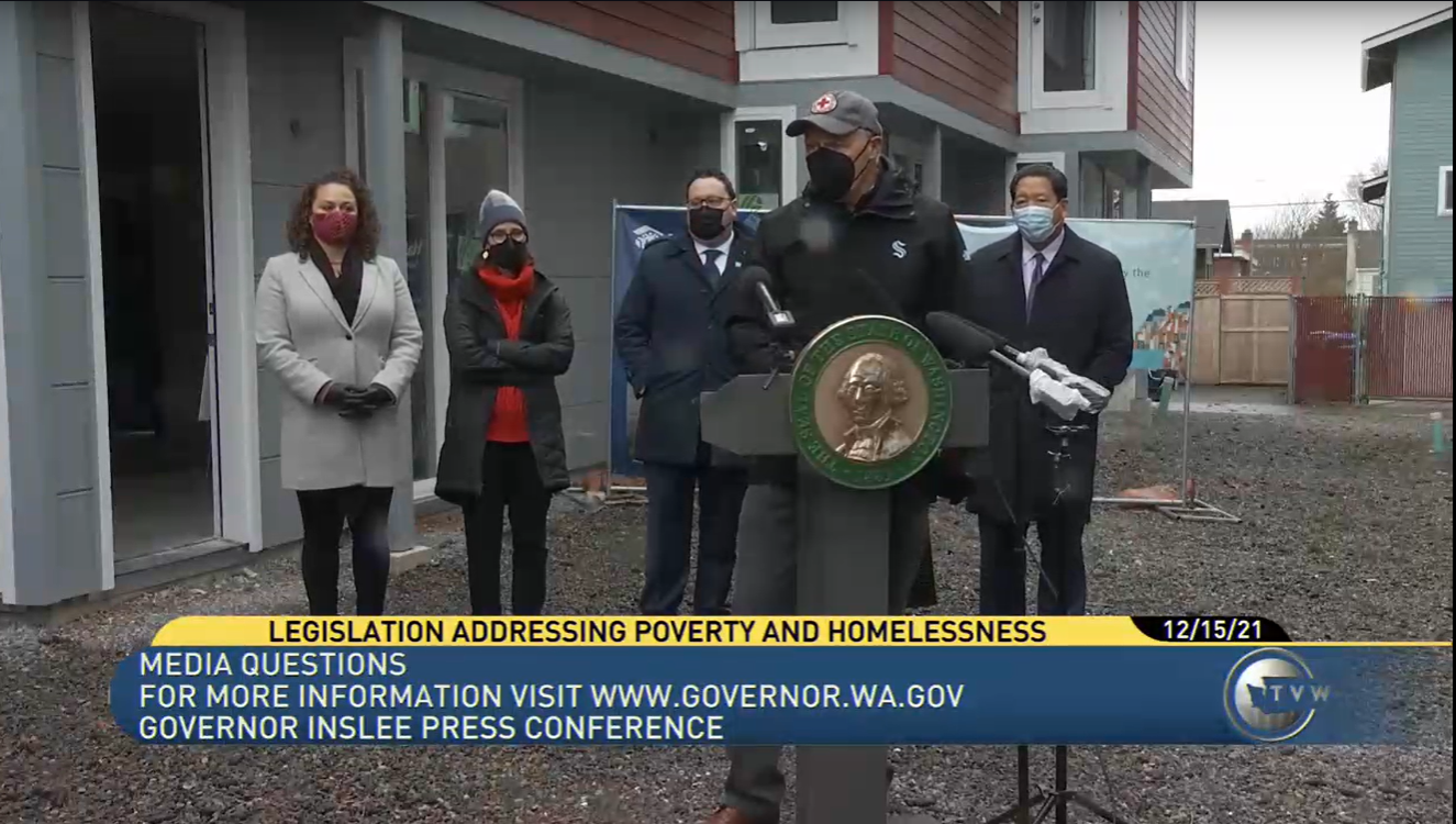Today, Governor Jay Inslee rolled out another big initiative, this one focused on housing and homelessness services. King County Executive Dow Constantine, Seattle Mayor-Elect Bruce Harrell, and Tacoma Mayor Victoria Woodards joined Inslee for a press conference at a Habitat for Humanity build site in Seattle.