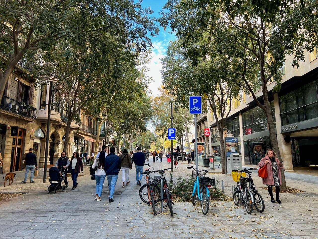 The Shared Streets Law enables Washington cities to move more easily to a future where cars are completely eliminated on certain streets. Note the car parking sign behind the bike parking sign on the Barcelona example below. While cars are allowed on this street, the superblock circulation plan makes it less useful as a through-route for cars. With well-designed shared streets, you don’t have to wait for property owners to decommission their driveways to create high-quality pedestrian-centered public spaces.