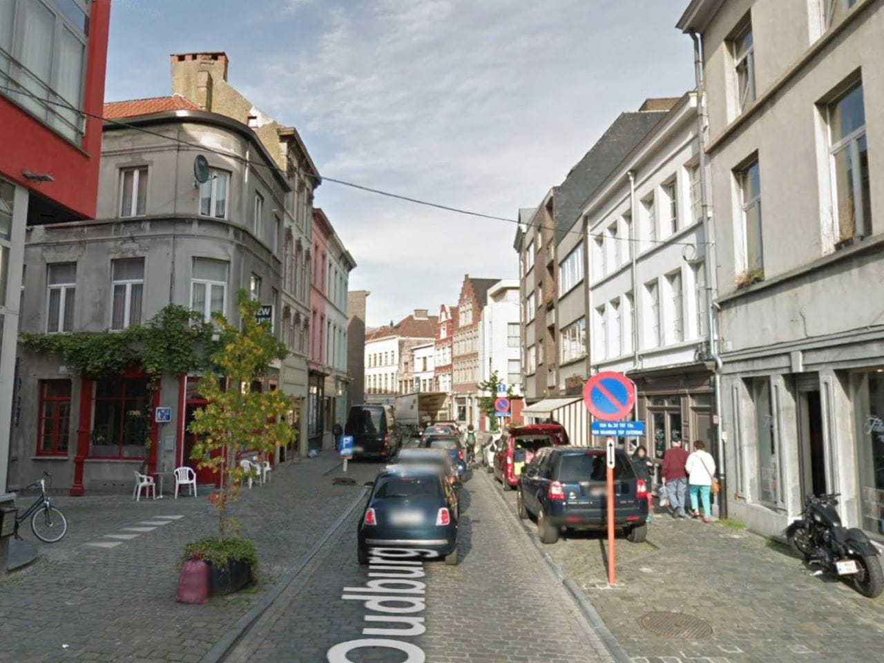 Oudburg, that shared street in Ghent, Belgium, is divided roughly into thirds, with fixed structures like tables, chairs, and bike racks on either side and a clear space in the center—indicated by distinct paving—shared by pedestrians, bicycles, and cars.