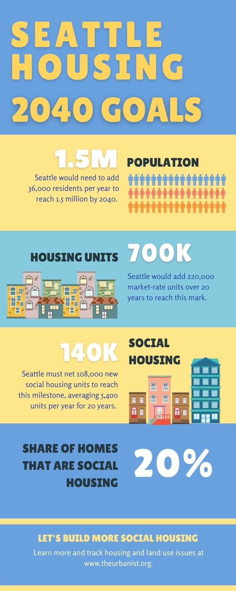 A 25% mark, meanwhile, could be hit by hitting 200,000 social housing units by the time Seattle has 800,000 homes or 250,000 by the time it has one million homes. The scenario laid out is a lot more aggressive than the conservative growth targets in the Seattle 2035 Comprehensive Plan. The planning document predicted just 70,000 new households by 2035, and at least half of that estimate has already happened in just five years. That inspired the more ambitious goals enumerated below.