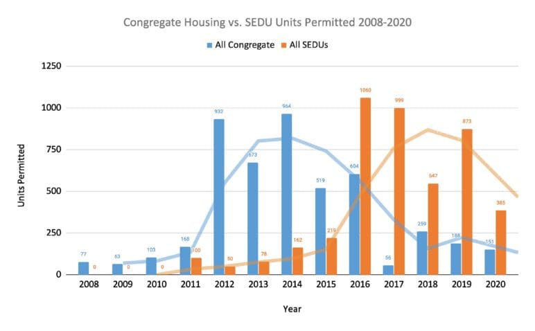 Neiman published an update in 2021 and his analysis of permitting data showed the micro-apartment pipeline didn’t dry up completely, but has tapered off — even in a period of high demand and climbing rents. Congregate unit permits are way down, and SEDU permits haven’t fully picked up the slack.