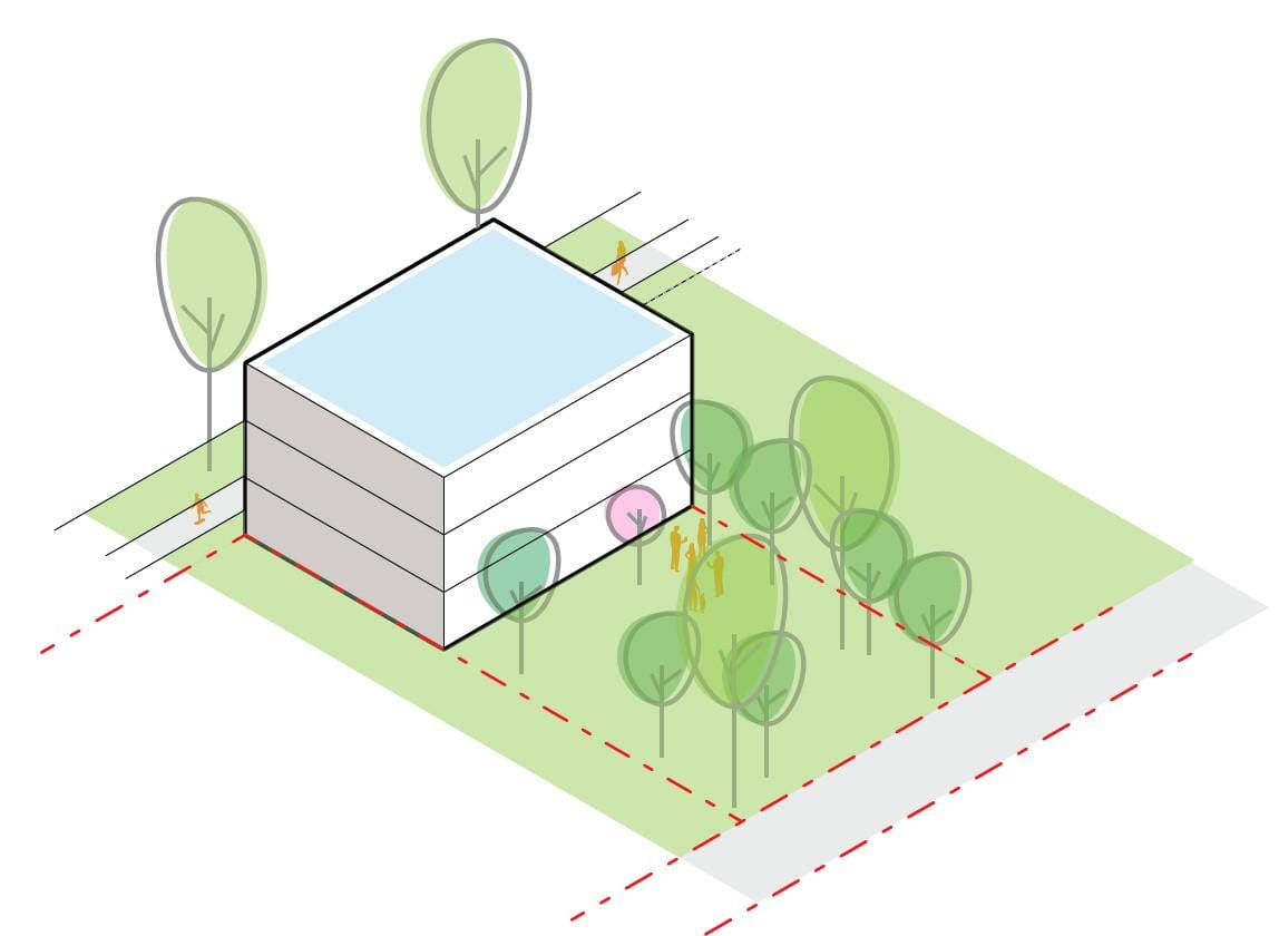 In short, European builders tend to build fairly tall buildings on a smaller portion of the lot than American urban builders , providing much more space for trees, green space, gardens, and so forth. Rather than rigid setbacks, an eco-friendly building often hugs a few of the lot lines with build-to lines which allows for better unit layouts, more contiguous space for trees, and the potential for a large garden to take shape.