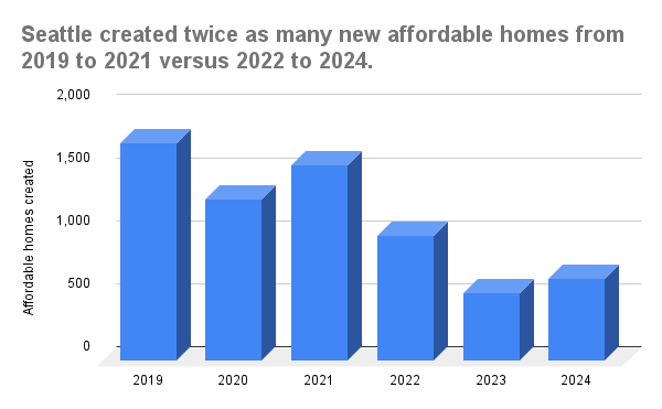 Harrell pointed to “passing the largest housing levy in City history in 2023” as another victory. That $970 million levy tripled the size of the previous levy it renewed, but unfortunately due to inflation and a financially reeling nonprofit housing sector, the increase in levy funds has not led to an increase in the rate of affordable housing production.
