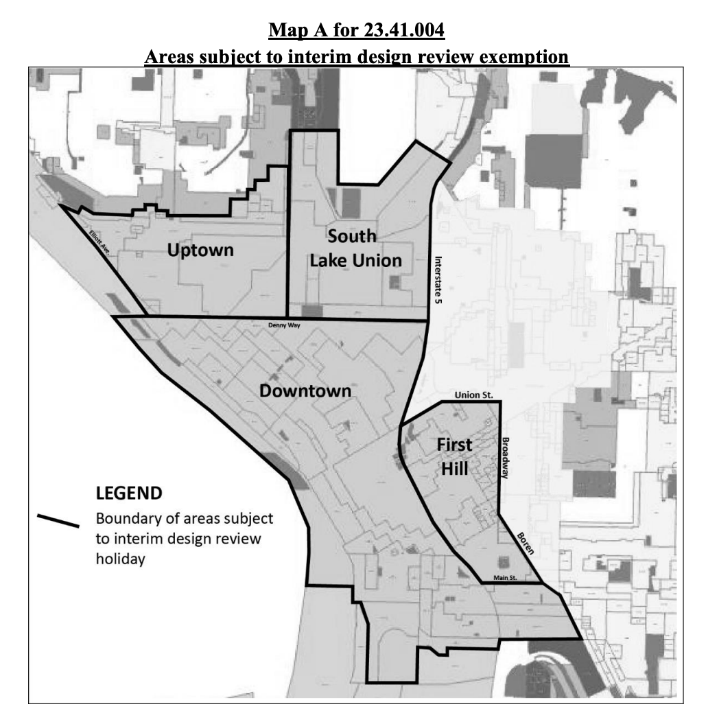 The legislation would apply for three years and provide design review exemptions in the Downtown, Uptown, South Lake Union, and First Hill Urban Centers for the following types of projects: