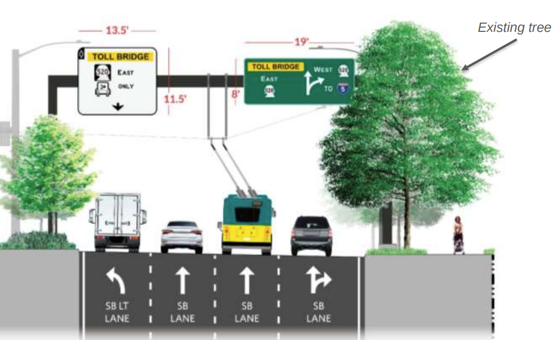 “[T]he SR 520/Montlake Boulevard interchange is one of the most complex interchanges in the state, with nine travel lanes across the Montlake lid and multiple turning movements to communicate to drivers in a relatively short distance,” an agency-created summary from that meeting noted. “Montlake Boulevard’s heavy traffic volumes and numerous lanes led WSDOT to design multiple larger signs as well as larger supports to carry the weight of the signs.”