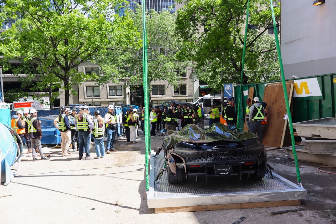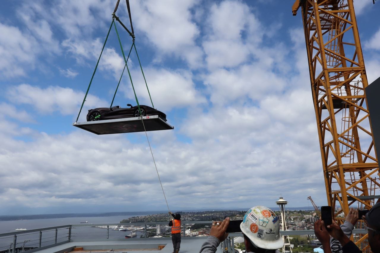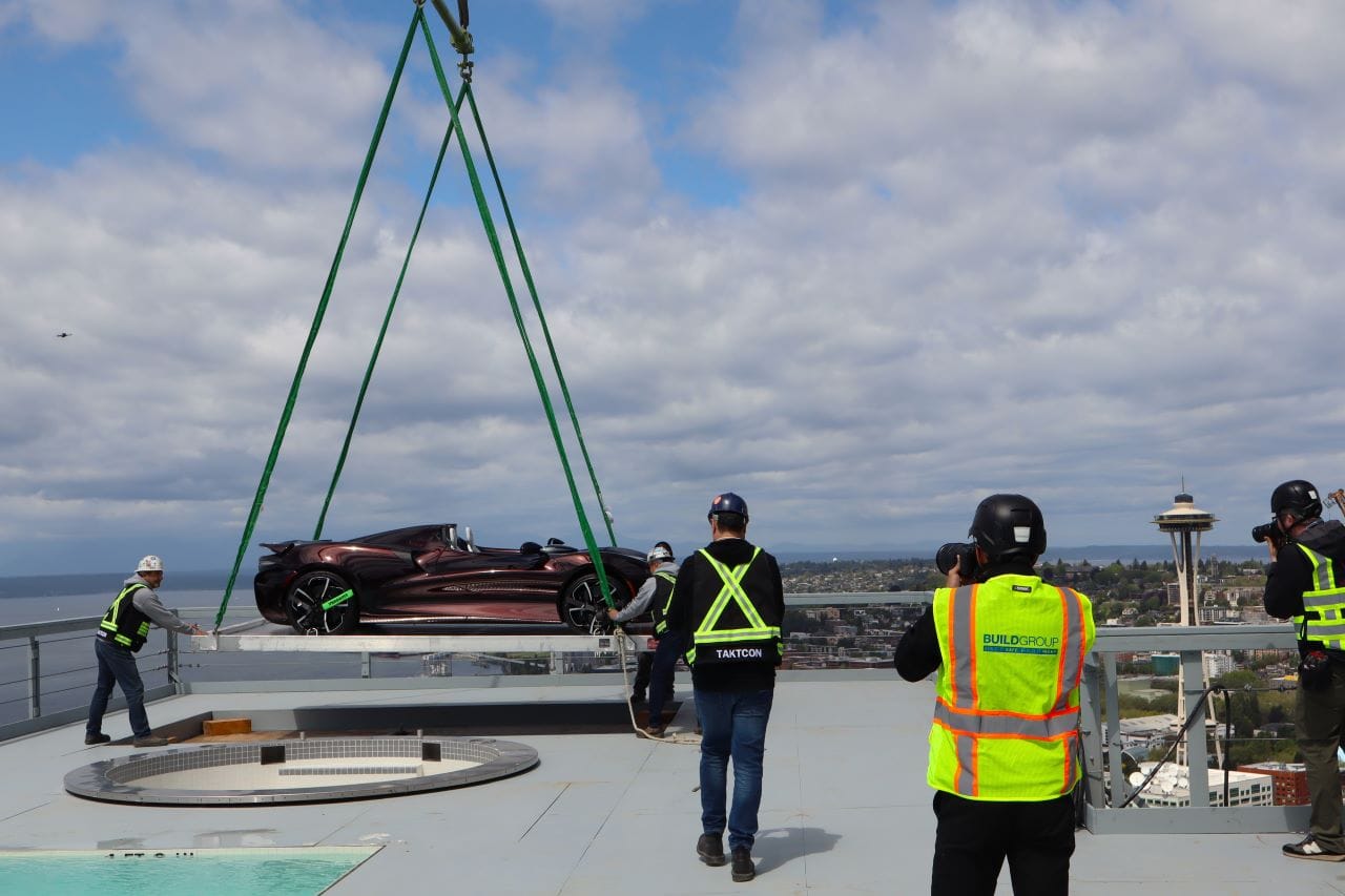 Last month I wouldn’t have been able to tell you what a supercar is. But last Friday, I stood among a select crowd watching as a crane hoisted one atop a new luxury tower called “First Light” at 3rd and Virginia in downtown Seattle. And we’re not talking just any old supercar. It was a McLaren Elva, which sells for $1,695,000 — that’s before you add bespoke options like exposed carbon fiber body panels, or a 24 karat gold heat shield for the engine compartment.