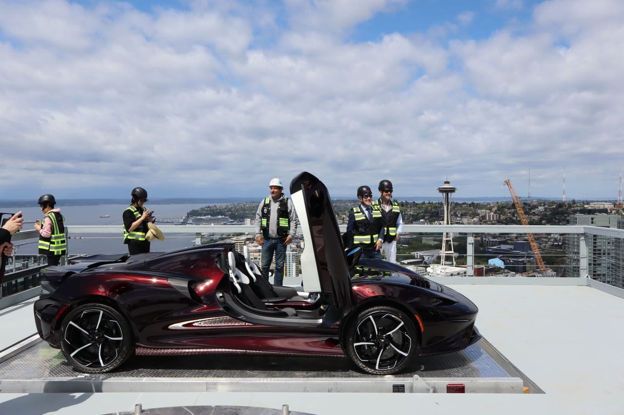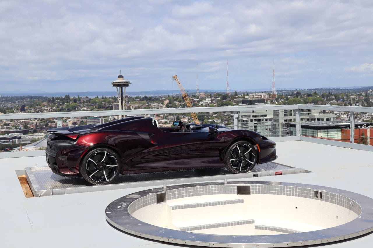 Strapped to its platform, the McLaren Elva ascended, and meantime we rode 47 floors up a very fast elevator to the rooftop pool deck, onto which the car was shortly lowered. It was sunny, the sky blue and the views tremendous. First Light’s future inhabitants will be able to gaze at the Space Needle and drink in the Sound (no, not literally) while lounging in the jacuzzi or turning morning laps in the pool. The Elva did look kinda neat sitting up there against all that scenery.