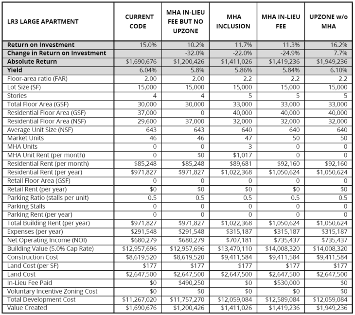 Sightline’s preferred solution of just doing the upzones without MHA could very well result in a big spike in land prices. Their pro forma illustrates the point. The 15,000 square foot lot zoned LR3 gains a million dollars in value and about a quarter million dollars in absolute return in the upzone without MHA scenario. Notably, that’s assuming land costs are the same across all scenarios; on the contrary, land values are likely to respond to the zoning changes. Land sellers would note the increased value and ask for higher prices. By avoiding the affordability requirement, developers would likely end up paying more to landowners. MHA moderates the tendency for upzones to send windfalls to landowners.