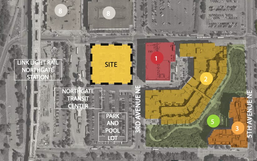 A stone’s throw from the Link light rail station in Northgate, Bridge Housing and Community Roots Housing have partnered to develop a seven-story building that will have 232 affordable homes with no onsite parking. The project is currently moving through administrative review process and the design proposal is available on the Seattle Department of Construction and Inspection (SDCI) website.