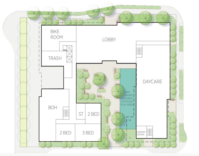 The preferred design option for the site includes a south facing courtyard. There are also plans for a daycare facility on the ground level of the development.