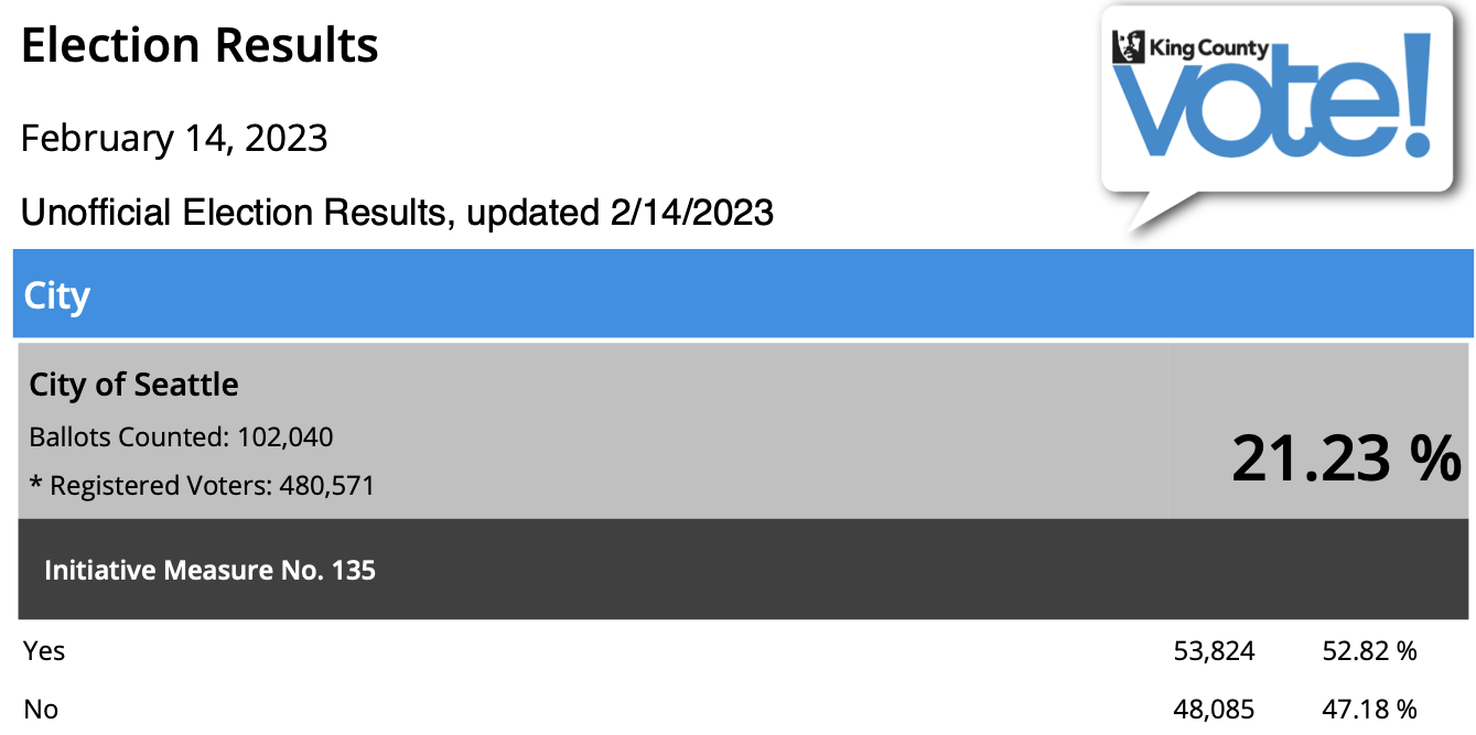 February’s special election in Seattle had its first ballot drop released last night and the results were encouraging for supporters of the Social Housing Initiative 135. So far the initiative is leading by a margin of almost 6%, with turnout at 21% via 102,040 ballots counted so far. Results will continue to be shared during the next week and a half and can be tracked on King County Elections website.