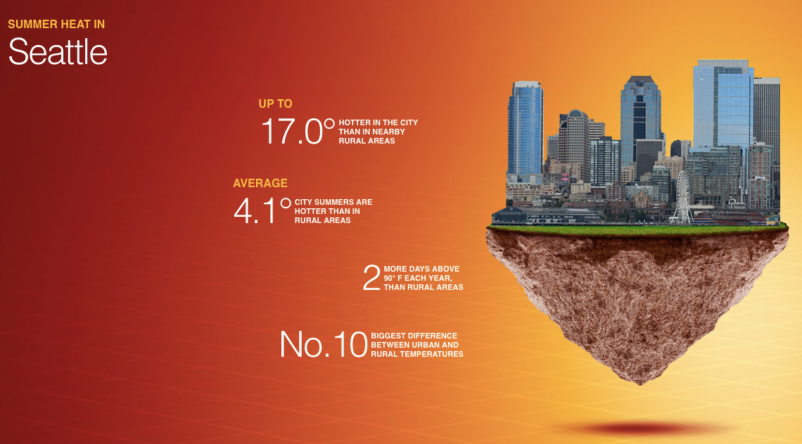 This trend can be found in Seattle as well. The city was ranked number ten in the nation for the biggest difference between urban and rural summer heat in report by Climate Central; additionally, an interactive map of urban heat island effect published by King County shows how the South End of Seattle and southern suburbs like Tukwila and Renton, all home to greater numbers of low-income and Black, Indigenous, and people of color (BIPOC) residents, suffer from higher than average urban heat impacts. These findings underscore the necessity of taking the issue of urban heat island effect seriously in our typically cool and rainy corner of the world.