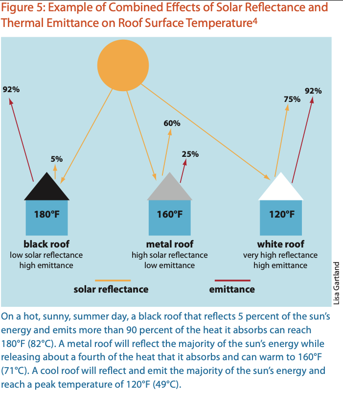 But other methods of creating cooler roofs exist, one of which is to use white material. White roofs are actually more efficient at combatting urban heat island effect than green- or living-roofs, and they are cheaper to install and maintain. When comparing the three roof types, a 2014 Berkley study was enthusiastic about their promise. “White roofs win based on the purely economic factors we included, and black roofs should be phased out,” said study co-author Arthur Rosenfeld, a Berkeley Lab Distinguished Scientist Emeritus and former Commissioner of the California Energy Commission.