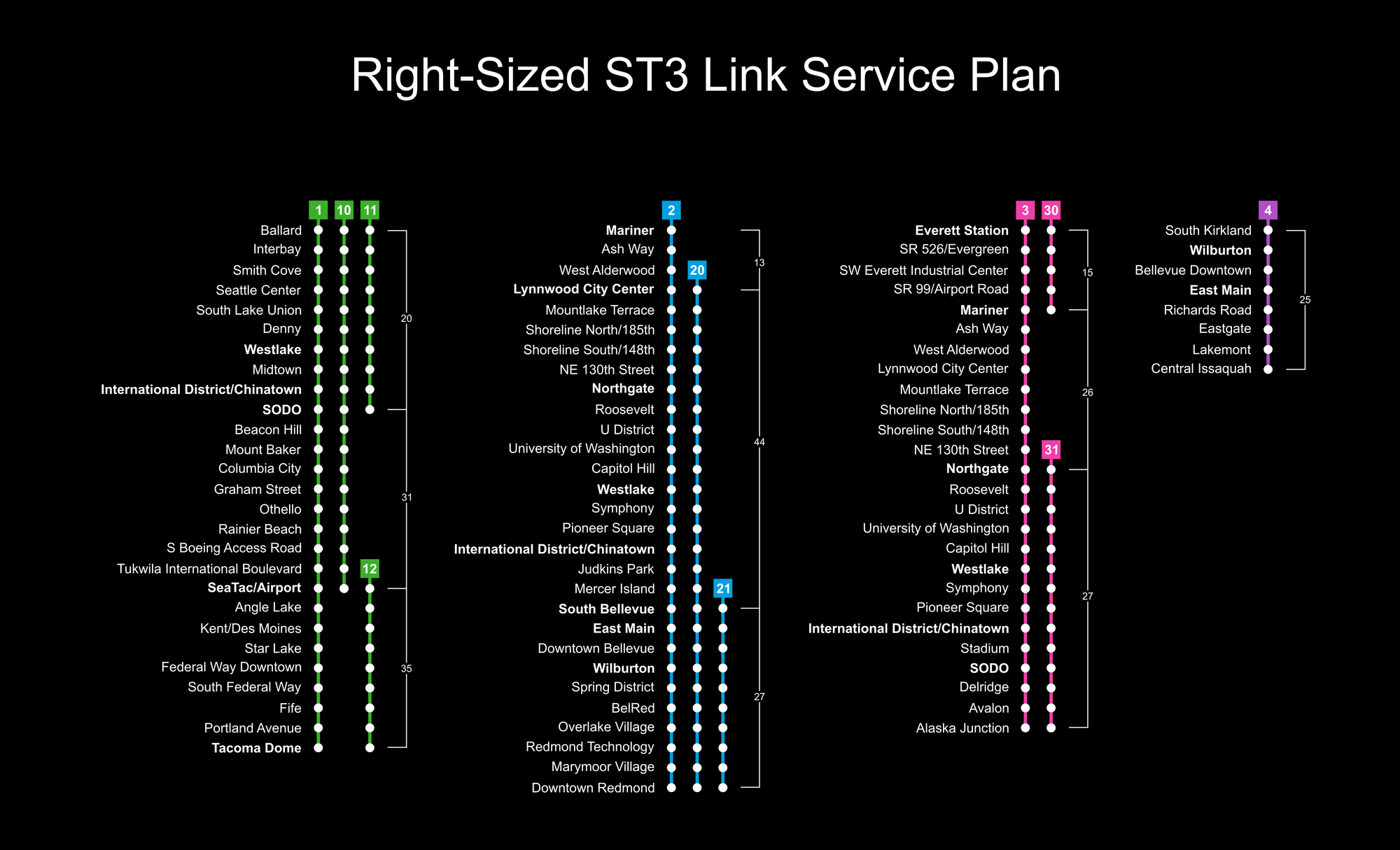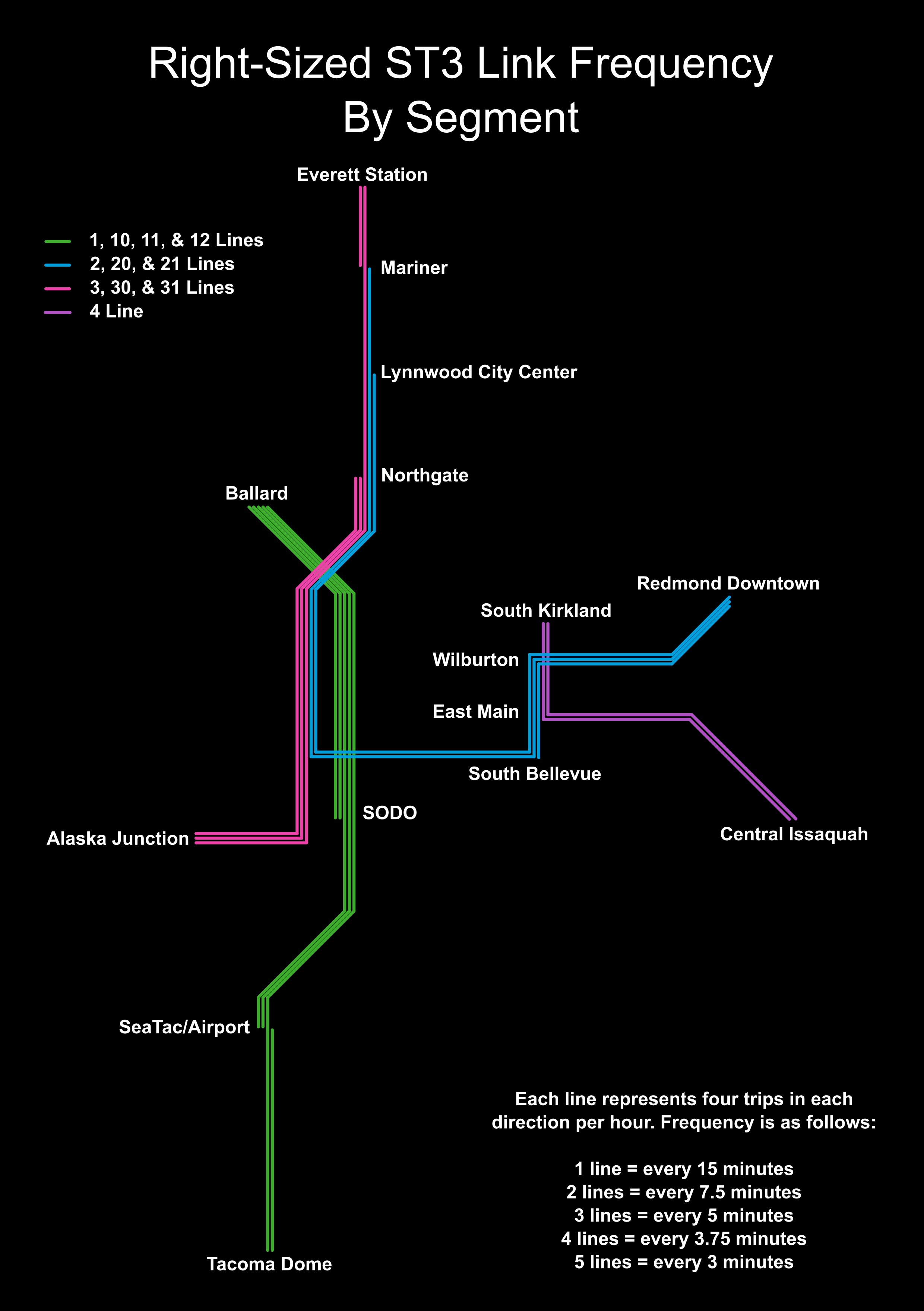 In the heart of the system, Sound Transit could provide combined frequency through the downtown tunnels every three minutes. This would offer a big service boost to Ballard, Uptown, U District, Capitol Hill, and Downtown Seattle where ridership is highest. To do this, the Ballard-SoDo segment would be served by three lines each with four to eight trips per hour. One of those lines would run as far as SoDo (11 Line) while the other two would be extended to the airport (10 Line) and Tacoma (1 Line). That has the knock-on benefit of the Rainier Valley getting service every five minutes — an improvement from today and over Sound Transit’s ST3 operating plan. Between International District/Chinatown and Northgate, service would be blended with four lines also offering high frequencies and access to West Seattle, Snohomish County, and the Eastside.