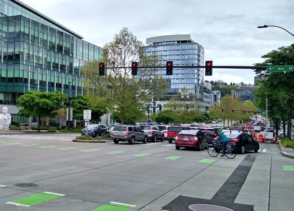 The new adaptive signals are intended to optimize traffic flow and learn from past traffic patterns to increase efficiency. But Mercer Street provides a pretty clear example of the ways improving throughput on a corridor in this way doesn’t benefit people trying to use the corridor outside of a car, and the signals won’t be able to do much to prioritize transit vehicles when they’re stuck in general purpose traffic. The signals along that corridor still direct people driving across streets that don’t have room for them, blocking crosswalks and places designated for people on bikes like clockwork. After activation of the adaptive signal system in 2017, pedestrians on the corridor became frustrated with the ways in which the traffic lights were behaving erratically, skipping phases and cutting off time to cross.