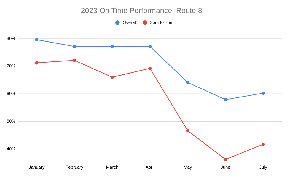 Data from King County Metro shows that following Amazon’s shift toward more in-person work on May 1, on-time reliability on the Route 8 plummeted, going from 77.1% of trips throughout the day being considered on-time (within 5 minutes) in April to 64.1% in May and 57.9% in June, rebounding only slightly in July. During peak evening commute hours of 3pm to 7pm, when demand to get on I-5 from Denny Way heading eastbound is at its highest, on-time reliability has been hovering around 40%. This is even lower than pre-pandemic lows experienced on the 8, with 54% of trips in July of 2019 being recorded as late.