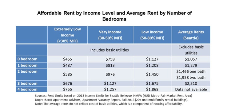 A review of some statistics and writing from this period show how quickly Seattle has changed. For example, in 2013 the average 1 bedroom apartment was still somewhat affordable to someone earning 50-80% of Area Median Income (AMI).