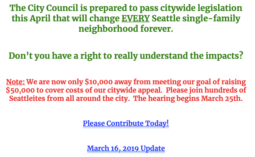 - SCALE announced in a recent press release that they will be meeting with media prior to the final MHA vote, and that they are “considering whether to file suit under Growth Management Act (GMA) to overturn MHA.” They are also actively fundraising for Seattle City Council candidates that oppose MHA.