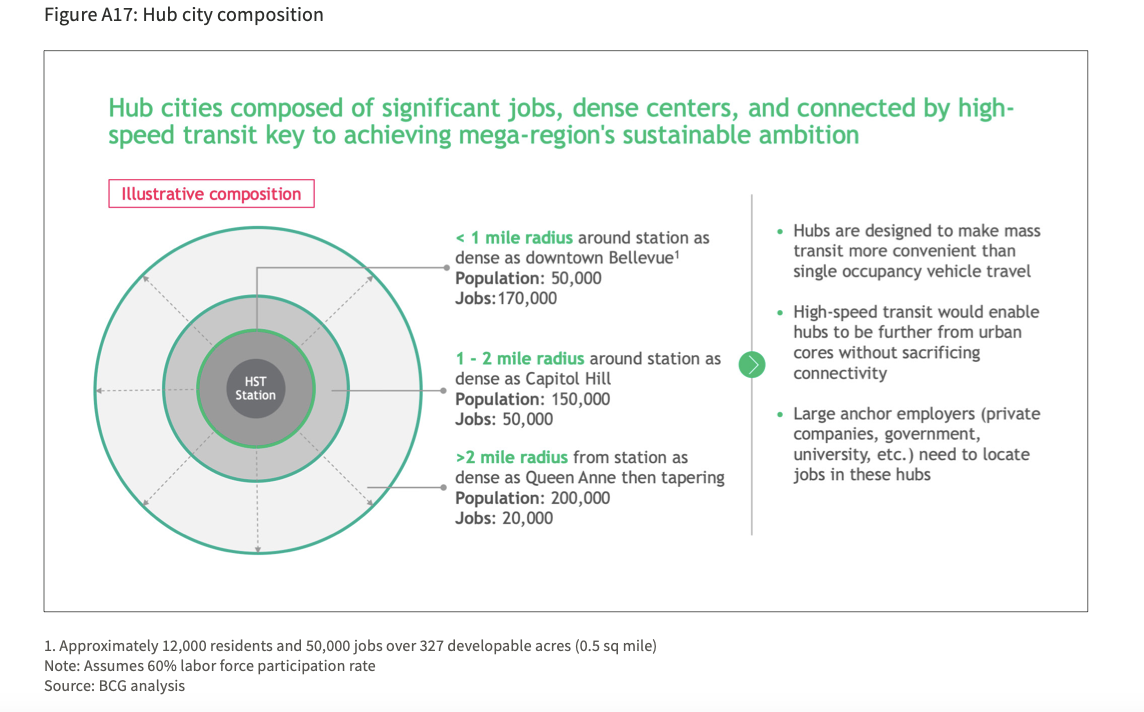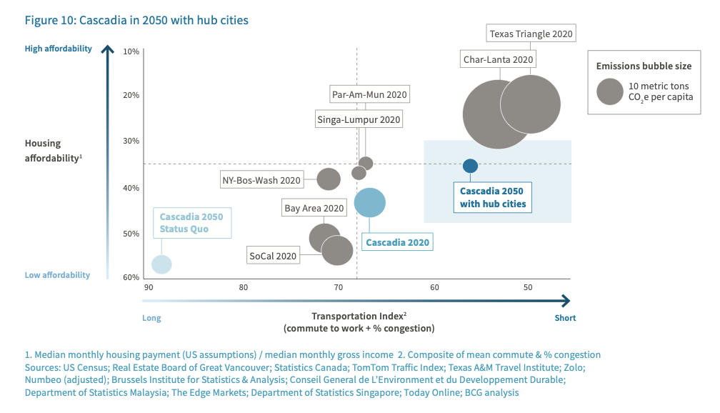 Cascade Vision 2050 projects that if a suitable number of hub cities are constructed, the region can change its trajectory on congestion, lack of housing affordability, and carbon emissions.