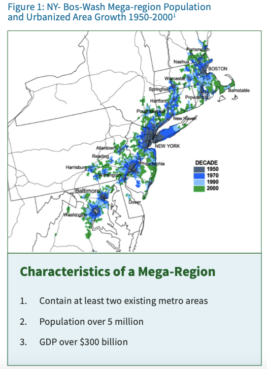 A study of mega-regions demonstrates that they often exhibit very different urban development patterns. Take for example the world’s two largest mega-regions in population size and GDP, NY-Bos-Wash (Boston-New York-Washington, D.C.) and Par-Am-Mun (Paris, Amsterdam, Brussels, Munich). The rise of NY-Bos-Wash accompanied the growth of the American highway system and the sprawling urban development patterns that sprung up around it, a trend that has worsened in more recent decades. On the other hand, Par-Am-Mun has a denser built environment largely planned around transit as a result of the influence of pre-automobile city planning and a greater emphasis on trains for transportation.