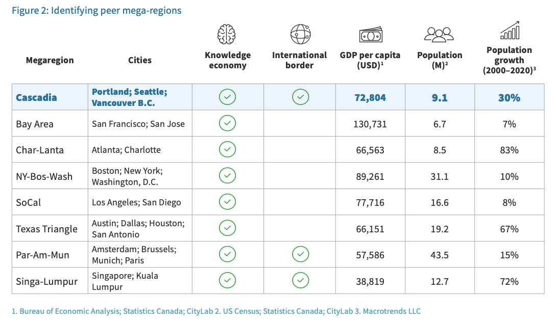As the world’s population has urbanized, mega-regions have grown in number and influence across the globe. A mega-region is broadly defined as a population center composed of at least two metro areas, over five million inhabitants, and a gross domestic product (GDP) that exceeds $300 billion. According to CityLab, the Cascadia mega-region currently ranks 16th globally, just below Char-Lanta (Charlotte-Atlanta). Many experts have presented evidence that these mega-regions play an outsized role in the global economy, sometimes eclipsing the power of the local jurisdictions and even nation states.