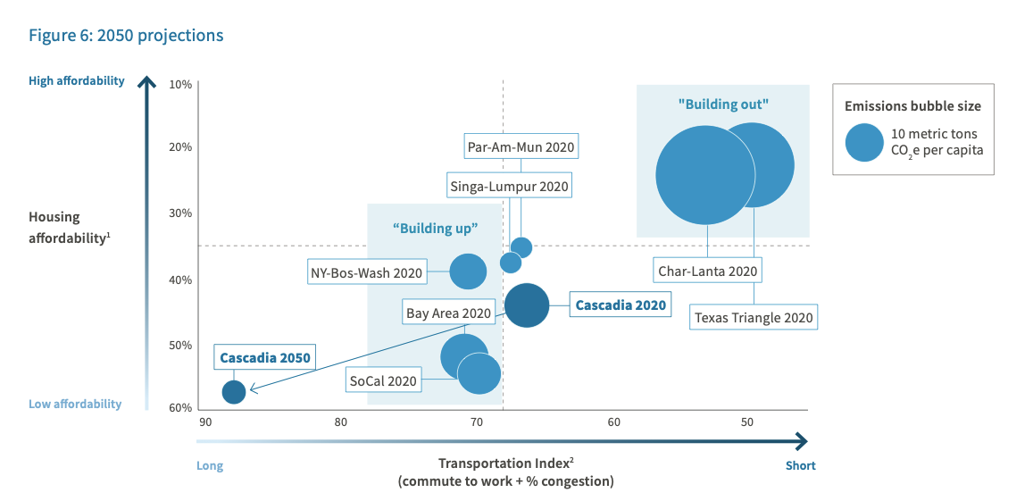 To put the projected problems in context, the report cautions that on its current trajectory the Cascadia mega-region will have higher housing costs than San Francisco or New York City by 2035 and longer commutes times than Los Angeles or San Jose by 2040.
