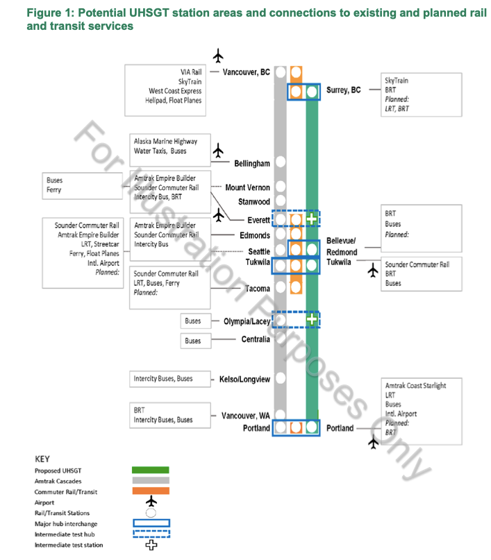 Other detractors may point to the fact that the alignment of proposed ultra high speed rail bypasses both existing urban centers, like Downtown Seattle and Vancouver, making the argument for hub cities altogether too convenient for developers.