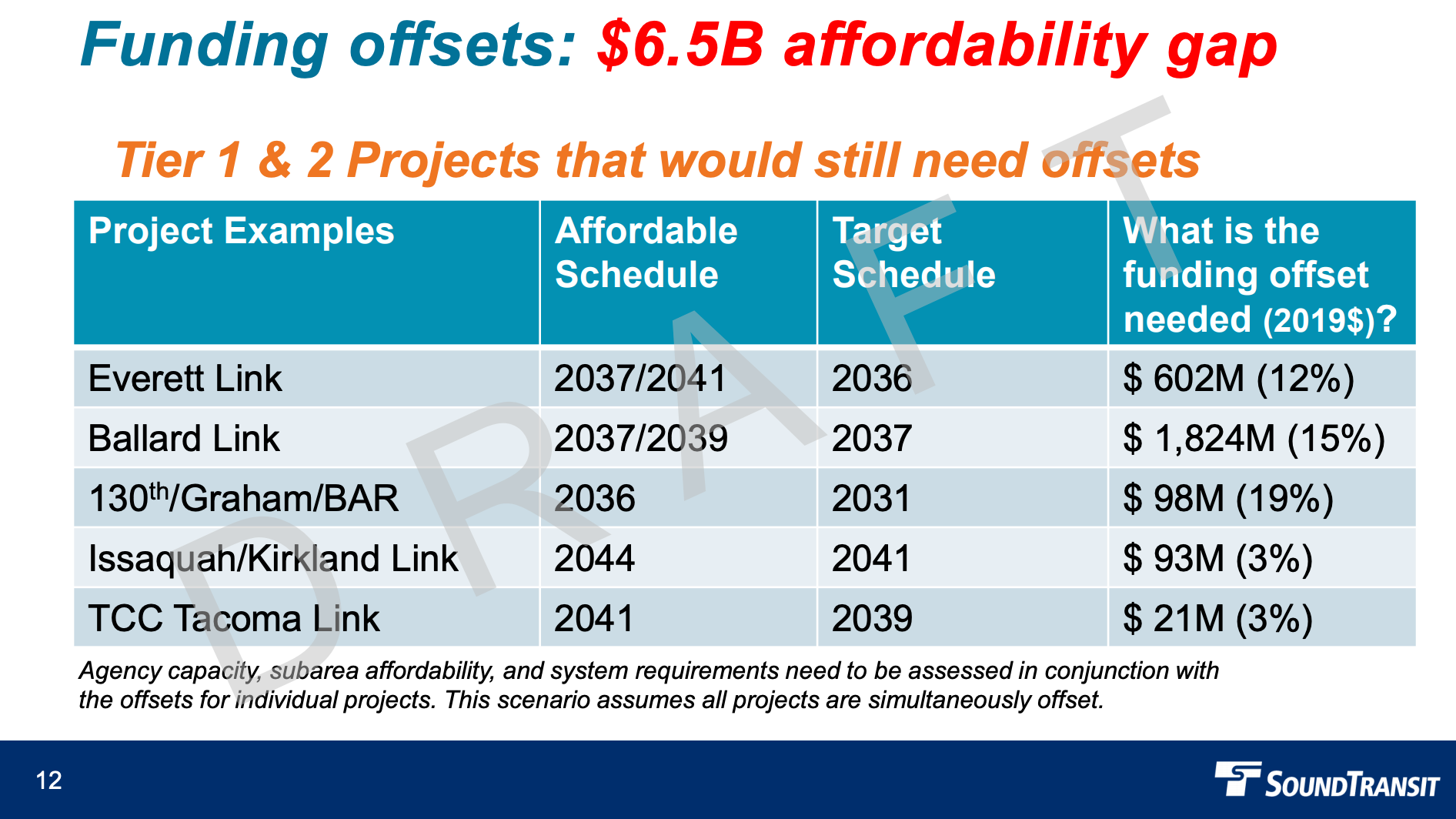 Conversely, the target schedule comes with two different scenarios. The base target schedule scenario assumes all projects will close the affordability gap and only “planning delays” like environmental review, permitting, and right-of-way acquisition would affect delivery dates. That means projects could have one to two years of delay over the voter-approved timelines, and in rare cases longer delays.As a practical matter though, Tier 1 and Tier 2 projects would remain a priority over Tier 3 and Tier 4 projects, so the target schedule path comes with an additional scenario to act a bit like a backstop. The alternative scenario assumes affordable schedule delivery dates for Tier 3 and Tier 4 projects while Tier 1 and Tier 2 projects are assumed to close their affordability gaps with near or on-time delivery, except for planning delays. However, the goal would be to fully fund Tier 1 and Tier 2 projects and work to eliminate any delays to Tier 3 and Tier 4 projects by closing affordability gaps.As for offsets, the agency has highlighted Tier 1 and Tier 2 projects where additional funding and project savings would be necessary to make the target schedule delivery dates. Two versions of the funding offsets were provided assuming the affordability gap at $7.9 billion and $6.5 billion. Looking at only the $6.5 billion affordability gap level, the following projects could meet their target schedule delivery dates if offsets are attained:Everett Link would need $602 million or 12% of its budget in offsets;Ballard Link would need $1.824 billion or 15% of its budget in offsets;Seattle infill stations would need $98 million or 19% of their budgets in offsets;South Kirkland-Issaquah Link would $93 million or 3% of its budget in offsets; andTacoma Community College-Tacoma Link would $21 million or 3% of its budget in offsets.Boardmember amendments proposed