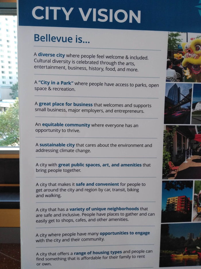 The City of Bellevue has been holding public meetings, in person and online, in which it is inviting comments about the future of Bellevue. At Bellevue Deep Dives, city employees meet with residents to discuss plans for the future of housing, accessibility, and transportation in the city, especially in view of the coming of light rail. At one such Deep Dive, there was the following poster:
