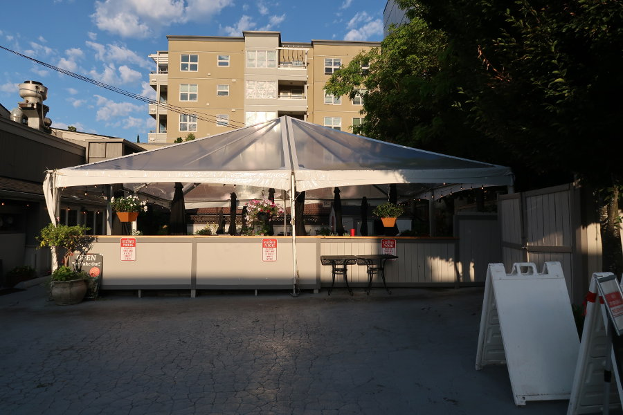 During our rainy season, outdoor dining probably wouldn’t work so well, unless canopies or tents were installed to protect diners from the rain, as was done with the following restaurant in Old Bellevue: