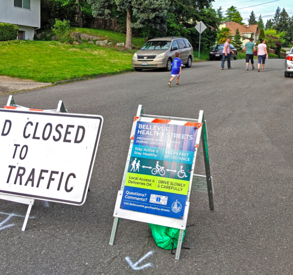 During the Covid-19 lockdown, many cities experimented with car-free zones, restricting cars to local traffic only. This was tried in Bellevue in 2020 where “[r]esidential streets in four neighborhoods were temporarily closed to non-local motor vehicle traffic to provide more room for people to safely move while physical distancing during COVID-19.” While a Healthy Street pilot was concluded early in Newport Hills due to resident complains, the pilots in three other neighborhoods received positive or mixed reviews. Seattle also had a similar program, Stay Healthy Streets/Keep Moving Streets, which has resulted in some streets remaining permanently open to pedestrians and cyclists.