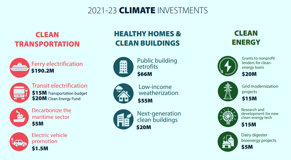 Just short of a fifth of Washington’s carbon emissions are from residential and commercial buildings, so significant dollars are being invested to reduce this energy usage with energy efficiency investments. Last week’s climate brief notes $141 million for cleaner buildings in the proposed capital budget. The brief highlights $55 million to weatherize and support energy efficiency investments for 7,000 low-income residences, $66 million to retrofit more than 200 public buildings, and $20 million to shift fossil-fueled equipment to heat pumps and other electric equipment.