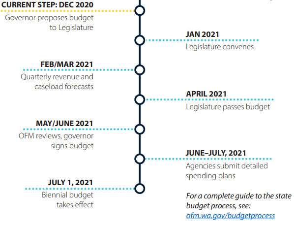 Now it’s up to the legislature that will start meeting in January to develop and pass a budget. After it’s signed by the Governor, the 2021-2023 biennial budget will take effect in July 2021. Now that it’s in the legislature’s hands, let your representatives know what you think of the budget and what you’d like to see in it.