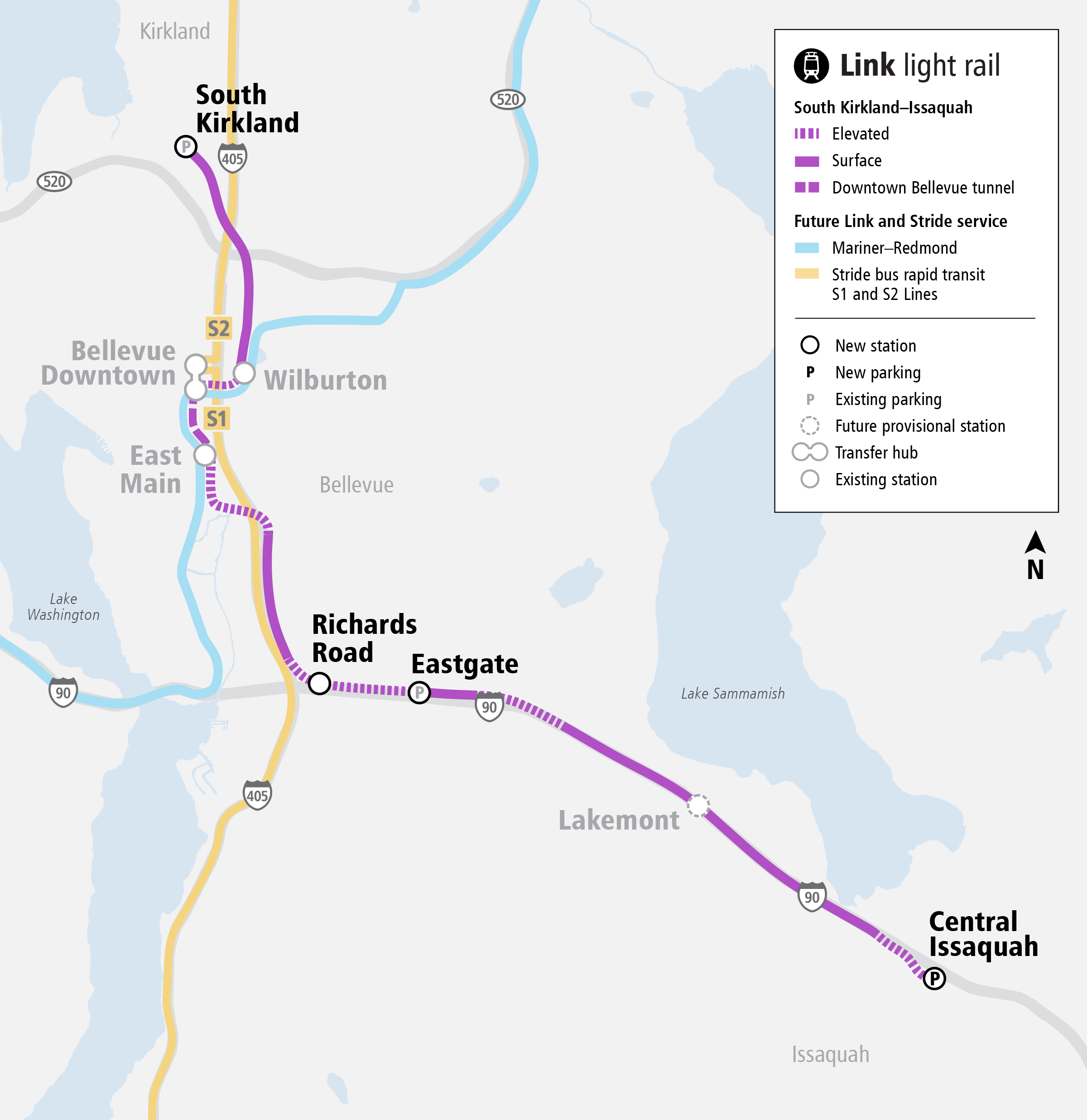 The planned South Kirkland-to-Issaquah Link line would terminate in Issaquah’s underutilized central core, which remains dominated by big box stores and parking lots despite longstanding plans to spur housing growth. The project would connect to the 2 Line in Bellevue via I-90, with two additional stations at Eastgate and Richards Road. A spur north of Wilburton Station would also connect to the South Kirkland Park and Ride, with that entire corridor opening as the 4 Line.