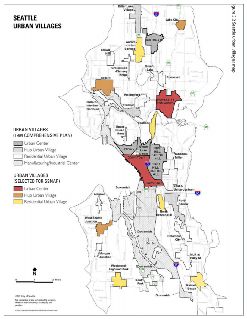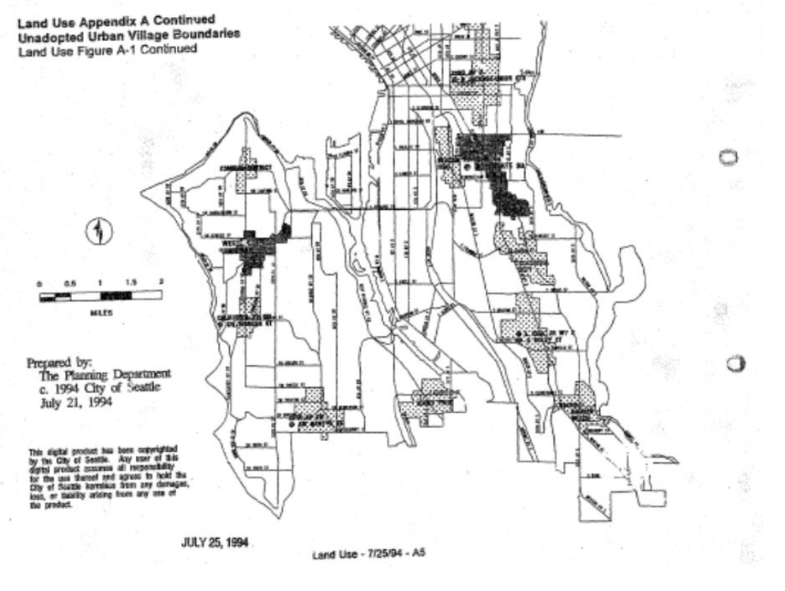 The drafters also didn’t fully trust the neighborhood planning process, stating: “… if at the end of the neighborhood planning cycle, a village boundary has not been established for a hub or residential urban village, the boundary shown in Land Use Appendix A of this plan shall become the boundary for that urban village” (page 10). On the whole, the framers of the 1994 plan got their way, with the urban villages created out of the neighborhood planning process resembling those proposed in 1994, with few exceptions.
