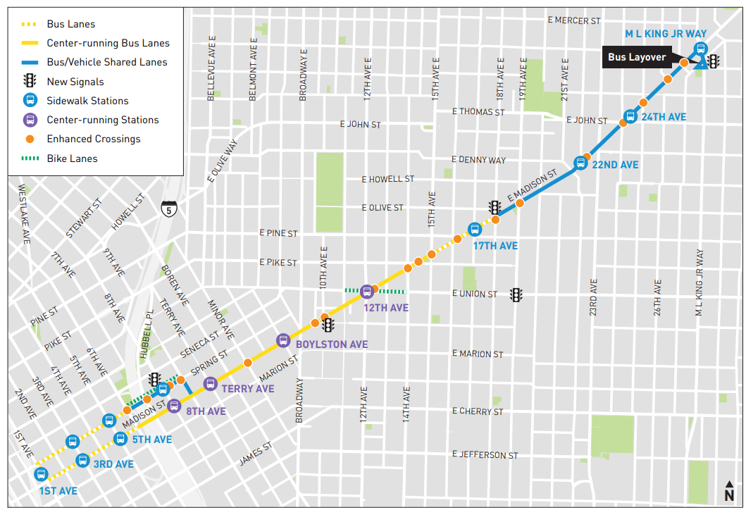 The RapidRide G will mostly operate in its own dedicated bus lanes, including the most congested segments downtown and around I-5. Through First Hill and Capitol Hill, buses will run along the center traffic lane, separating them from any other vehicles turning right, and riders will board from brand new stations in the median of Madison Street, mirroring stations along Jackson Street used by the First Hill Streetcar.