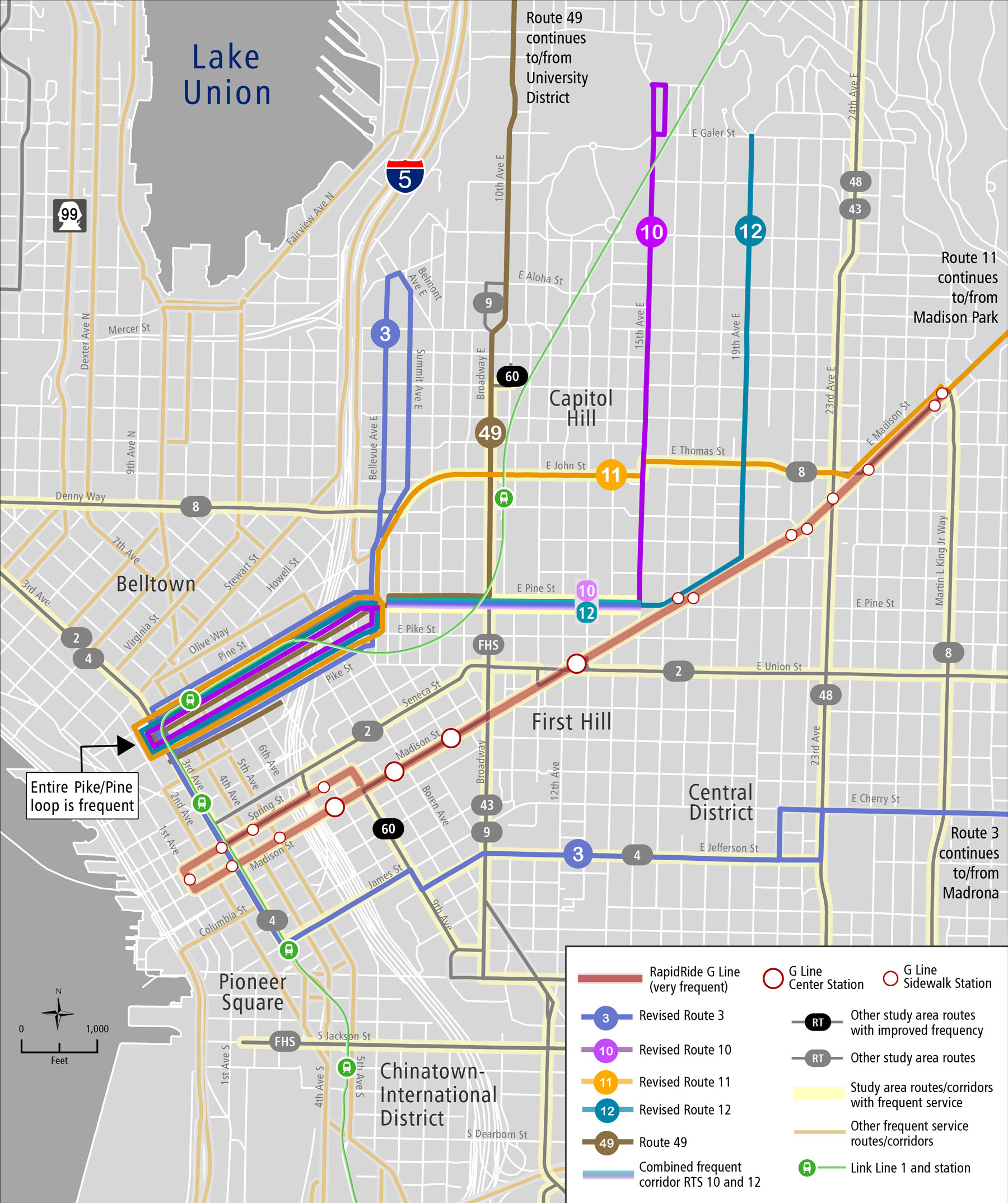 The G Line will take over for Routes 11 and 12 along Madison Street between Downtown Seattle and Madison Valley, offering both increased frequency and significantly quicker trips for riders along the corridor. With the service change on September 14, King County Metro is restructuring bus routes in the area to feed the new rapid line, with some neighboring routes seeing frequency cuts. Thanks to pressure from advocates, Metro’s restructure revived Route 47, as a Summit Avenue tail of the revised Route 3.