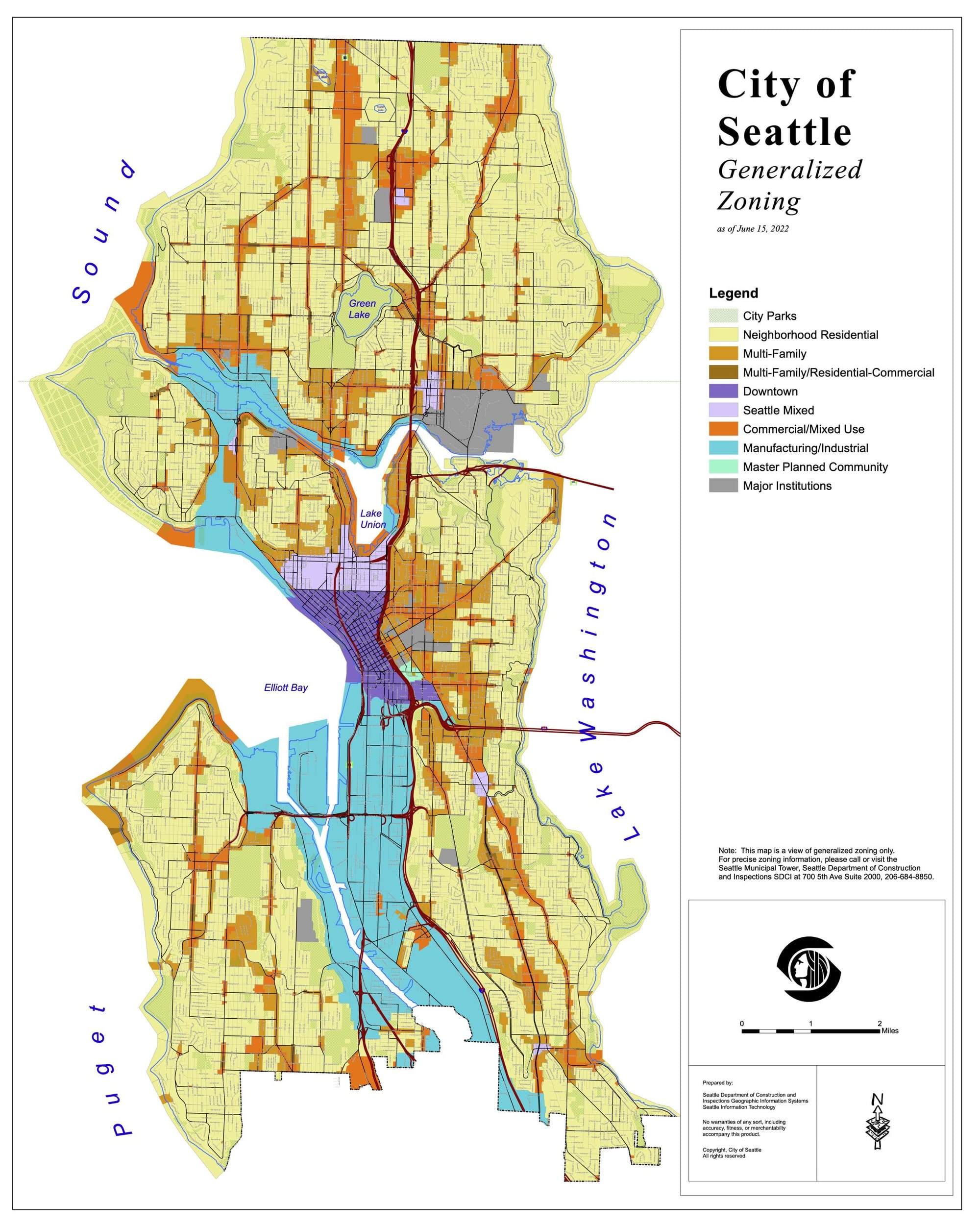 As many an urbanist has pointed out, Seattle’s zoning map strongly echoes through in maps of political results. Areas zoned for high-density housing swing toward progressives, to a large degree. Political shifts from election to election are largely a matter of how steep the turnout advantage is for single family areas and which way medium-density neighborhoods swing. Apartment zones are shown in orange, brown, or purple in the zoning map below, while single family zones are a canary yellow.