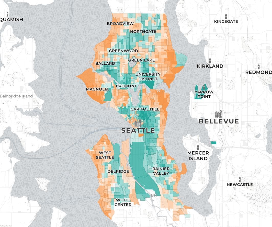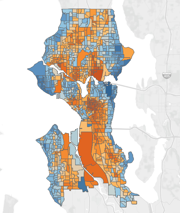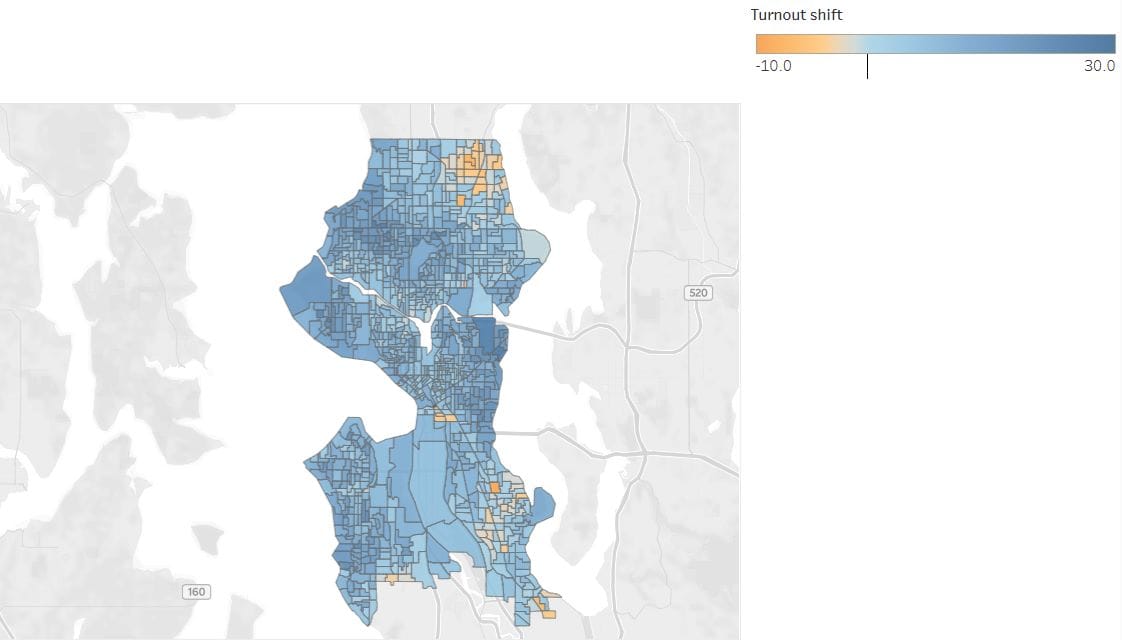Data scientist and local urbanist Jason Weill created an interactive final precinct results map that tells the tale. In Weill’s color scheme, precincts that Wilson won are orange and Harrell’s precincts are blue. The darker the shade of color, the greater the margin of victory. Washington Community Alliance also has a precinct results mapping tool that covers races statewide.