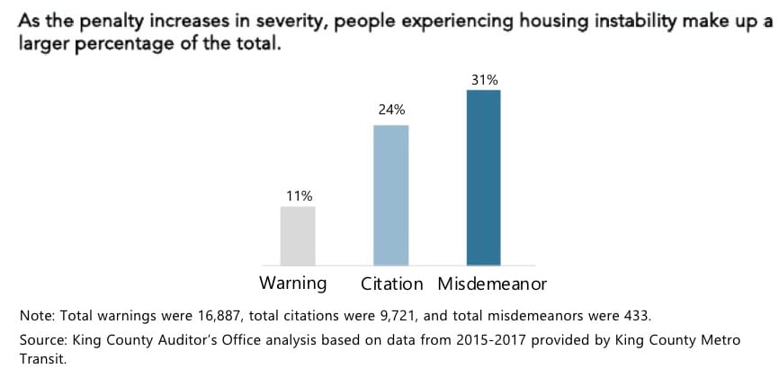 - “Nearly 25 percent of all citations and 30 percent of misdemeanors are given to people who are homeless or experiencing housing instability, potentially creating debt and interactions with the criminal justice system. Those experiencing housing instability may have difficulty paying the fare or fine, which could create additional negative impacts beyond the citation. For example, the fines for individuals experiencing housing instability totaled just over $290,000 from 2015-2017. These fines, when unpaid, go into collections, which can then impact a person’s ability to obtain housing.”